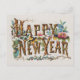 Ilustración vintage Feliz Año Nuevo diseño de vacaciones originalmente publicado por Currier & Ives en 1876 con las palabras "Feliz Año Nuevo" escritas en ramas de árboles y decoradas con acebo, bellotas y flores celebrando todas las estaciones del año.