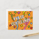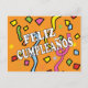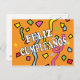 Feliz cumpleaños en español para cumpleaños, fiesta de fiesta o saludos. Palabras en blanco sobre un diseño de confeti fiesta muy colorido y fondo naranja.