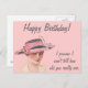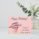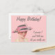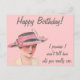 Esta postal muestra una imagen vintage de una mujer, en un fondo rosado. El texto dice: "¡Feliz cumpleaños! Prometo que no diré la edad que tienes".