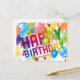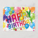 Un diseño de tarjetas de cumpleaños vibrante con una colorida gama de globos de varias formas y tamaños. La palabra "Feliz Cumpleaños" se exhibe de manera prominente en letras atrevidas y juguetonas, rodeadas de confeti y estrellas.