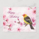 Postal Feliz Cumpleaños Acuarela Flor de Cerezo y Pájaro