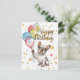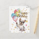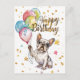 Un lindo Bulldog Francés sostiene globos de cumpleaños y desea Feliz Cumpleaños.