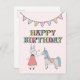 Feliz Cumpleaños con Feliz Cumpleaños en letras de garabatos en colores pastel y adornado con puntos. Banderines de garabatos en colores alternos y un conejo de dibujos animados con vestido rosa sosteniendo una flor de tulipán para un unicornio gris.