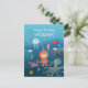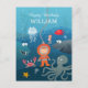 Esta linda tarjeta de Feliz Cumpleaños presenta a un pequeño buzo valiente que explora un mundo submarino. Está rodeado de varios animales submarinos: pulpo, tiburón, cangrejo, medusa, corales. Todos los animales acuáticos son muy amigables y sonrientes. Gran tarjeta para enviar con motivo del cumpleaños de un niño, especialmente si al niño le interesa la vida submarina.