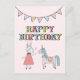 Feliz Cumpleaños con Feliz Cumpleaños en letras de garabato en colores pastel y adornado con puntos. Banderines de garabato en colores alternos y un conejo de dibujos animados con vestido rosa sosteniendo una flor de tulipán para un unicornio gris.