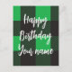 Un diseño fresco con un patrón de cuadros verdes con las palabras Feliz Cumpleaños Tu nombre. Haz clic en personalizar y agrega un nombre.