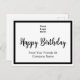 Puedes agregar tu logotipo en la parte frontal de esta tarjeta postal. El logotipo estará encima de un texto que dice Feliz Cumpleaños. Dos líneas de texto de visualización están debajo del texto para tu mensaje personalizado. La tarjeta postal tiene un borde negro.