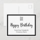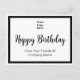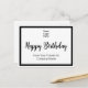 Puedes agregar tu logo en la parte frontal de esta tarjeta. El logo estará encima de un texto que dice Feliz Cumpleaños. Dos líneas de texto de visualización están debajo del texto para tu mensaje personalizado. La tarjeta tiene un borde negro.