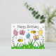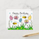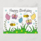 Tarjeta postal de cumpleaños de naturaleza linda para aquellos que aman los insectos y las flores. El diseño muestra tres flores coloridas que crecen desde la hierba verde larga. Vuelan alrededor de las flores dos abejas amarillas y negras y dos mariposas coloridas. En la parte superior del frente de la tarjeta dice feliz cumpleaños en texto gris oscuro.