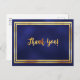 Una tarjeta de agradecimiento para un cumpleaños importante. Un color de fondo azul marino oscuro y un marco dorado falso. El color azul es desigual. En la parte delantera, un estilo de letra a mano y el texto: ¡Gracias!