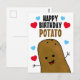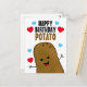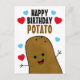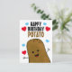 Diviértete feliz patata marrón rodeada de corazones de amor rojos y azules con Feliz Cumpleaños Patata en letras negras y marrones encima de su cabeza.