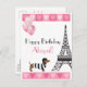 Este diseño de moda en París cuenta con la torre Eiffel con un dachshund y globos rosa purpurina con bordes purpurinas rosados del corazón. Personaliza fácilmente esta tarjeta de cumpleaños feliz con un nombre, dirección y saludo de cumpleaños en un texto elegante en negro y rosa.