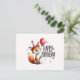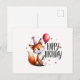 Envía tus deseos de cumpleaños de la manera más linda con esta tarjeta postal de "Feliz Cumpleaños" que presenta a un delicioso zorro sosteniendo un globo y usando un sombrero de fiesta. Esta encantadora ilustración captura el espíritu alegre de los cumpleaños con un zorro sonriente y detalles festivos como estrellas y confeti. Perfecta para niños y adultos por igual, este diseño caprichoso es ideal para difundir la alegría de cumpleaños y hacer que cualquier celebración sea aún más especial. Comparte la alegría de un cumpleaños lleno de diversión con esta adorable tarjeta postal temática de zorro.