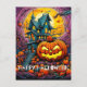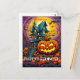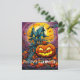 Esta postal única presenta una calabaza espeluznante después de oscurecer, frente a una casa embrujada.