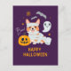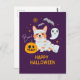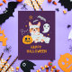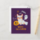 Esta adorable postal de Halloween presenta un ilustracion juguetón de un Corgi envuelto en vendas de mampostería, rodeado de elementos de Halloween como una linterna espeluznante de jack-o', un fantasma amistoso, murciélagos y una telaraña. Con un fondo morado profundo, aparece el brillante naranja de texto "Halloween feliz", lo que lo hace una elección divertida y festiva para los amantes del perro y los entusiastas de Halloween por igual. Perfecto para difundir la alegría de Halloween con un toque de cortesía.