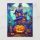 Esta impresionante postal presenta una casa embrujada con temática de Halloween en la temporada de otoño.