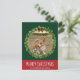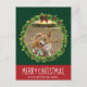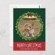 Hermosa postal de Navidades mascotas personalizados con una corona de vacaciones verde con un rectángulo rojo y texto blanco. Reemplace con la foto de su perro en el centro de la corona o agregue una foto de su gato a sus amigos y familia. Feliz Navidad está escrito en blanco.
