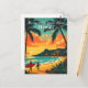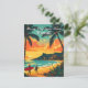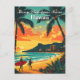 Postal festiva con Navidades tropicales de Hawaii con surfistas en sombreros de Santa, palmeras y una playa de atardecer dorado. Una tarjeta de felicitación de vacaciones única y divertida.