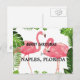 Feliz Navidad desde Naples, Florida, diseño tropical con hojas de palma y hermosos flamencos rosados.