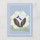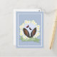 Esta feliz postal de Pascua presenta una floral bonito de margarita feliz de Pascua con orejas de conejito gris y mariposas sobre un fondo azul.