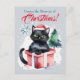 Los Navidades de navidad saludan la postal de los gatos, el lindo gato negro de ojos verdes dentro de la caja de regalo árbol de Navidad, la tarjeta postal de los Navidades para los amantes de los gatos.