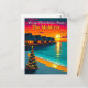 Una postal retro festiva que presenta una Navidad tropical en Maldivas con villas sobre el agua, un árbol de Navidad decorado y una cálida puesta de sol dorada. Perfecta para enviar saludos navideños desde el paraíso.