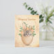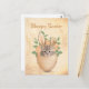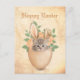 Tarjeta de felicitación Happy Easter Vintage, ilustracion con un bonito gatito de conejo, cesta con huevos y flores.