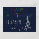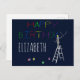 Una hermosa dama de casco blanco se para en una escalera de escalada. Un martillo y un cincel en sus manos. Ella cincha o talla el texto FELIZ CUMPLEAÑOS y pinta cada letra en colores. Cinco baldes de pintura de color paran cerca de la escalera. Nombre de plantilla Elizabeth de color blanco a la izquierda de la escalera. Puede cambiar o eliminar el nombre del personalizable de plantilla como desee. Graciosa, única, postal única para cualquiera. Para cambiar el tipo o el color del tipo de letra o reubicar el texto y la imagen simplemente utilice el botón PERSONALIZAR, elija otro tipo de letra del menú desplegable a la derecha del botón "Editar texto". ¡Diviértete y sé feliz!