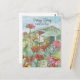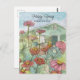 Primavera feliz en su nueva casa con una casa pintada en verde sabio suave con un vibrante jardín de zinnia en el patio delantero dibujado con tinta y pintado con acuarela en alegres tonos de naranja, rosa y rojo. Puede editar el texto para que se ajuste a sus necesidades y agregar los detalles de su negocio al dorso.