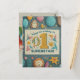 La parte delantera de la tarjeta presenta un diseño vibrante y alegre con un tema lúdico y caprichoso. En el centro, el lema "¡Feliz primer cumpleaños a nuestra pequeña superestrella!" está escrito con letras atrevidas y juguetonas con una mezcla de colores brillantes como azul, rosa y amarillo. Alrededor del texto hay adorables ilustraciones de animales personalizados sonrientes —como un oso de peluche, un conejito y una jirafa— cada uno llevando gorras fiestas y rodeado de globos coloridos y confetti. En la parte inferior hay un bonito pastel decorado con una sola vela, con el número "1" encima, que da un toque festivo.
