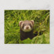 Una postal con una fotografía adorable en la que aparece un pequeño hurón marrón parado en un pasto largo. ¡Cuidado como puede ser!