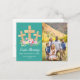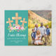 Una deliciosa postal de Pascua para enviar bendiciones de tu familia a otra. La parte izquierda tiene un ilustracion acuático de 3 cruces de madera decorados con flores rosas y hojas verdes, sobre un fondo verde azulado. Debajo está el titular "Bendiciones de Pascua de nuestra casa a la tuya" en tipografía blanca y serif, que puede ser editada. La parte derecha muestra su retrato familiar favorito. Puede escribir un mensaje al revés o dejar en blanco una nota manuscrita.