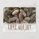 Conos de pino rústicos y festivos acentúan este diseño clásico y elegante que desea Amor y Alegría en las fiestas.