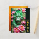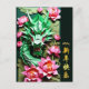 Dragón verde recortado en papel con peonías rosadas sobre fondo verde oscuro + Deseos en chino + dorado 2024. Diseño para tarjeta postal de vacaciones. Tarjeta de felicitación y pegatina rectangular coincidentes. Perfecto para el Año Nuevo Chino del Dragón 2024.