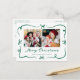 Envía saludos festivos con esta caprichosa postal de los Navidades con dos fotos cuadradas enmarcadas por arcos verdes y cinta adhesiva. Un fondo blanco mantiene el diseño fresco y moderno, mientras que "Feliz Navidad" aparece en un guión verde escrito a mano sobre el nombre de tu familia en la coordinación de las letras del serif. La parte trasera incluye espacio para tu dirección de regreso y un mensaje personalizado de vacaciones, lo que lo convierte en una alegre elección de postal para difundir alegría a la familia y amigos esta temporada de Navidades.
