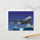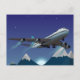 Diseño vectorial exclusivo de avión multimotor volador, colores azules. Un chorro gigante. Montañas, sol y estrellas en el fondo.