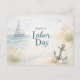 Este diseño sereno del Día del Trabajo evoca la calma de un tranquilo escape costero, simbolizando el descanso después de un arduo trabajo. Situado en un fondo suave y texturizado, lavado por el sol, el mensaje "Feliz Día del Trabajo" aparece en una suave escritura azul, rodeado de una imagen pacífica de la orilla del mar. Un barco de vela se desliza a través de aguas tranquilas bajo gaviotas volando, mientras que hierbas de playa, conchas marinas, una estrella de mar y un ancla envuelta en cuerda descansan a lo largo de la orilla. La paleta silenciada y la composición aireada crean un ambiente relajante y reflexivo, perfecto para celebrar el Día del Trabajo como un momento de relajación merecida junto al mar.
