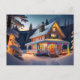 Christmas postcard featuring a beautifully decorated holiday home in the snowy mountains.