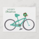 Un juego de diseño retro con una bicicleta verde con una corona de vacaciones en las barandillas. El mensaje dice 'Feliz Navidad'.