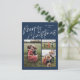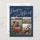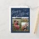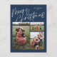 Blue Merry Christmas Caligraphy Script 3 Photo Holiday Postcard presenta un guión moderno de caligrafía en la parte delantera, junto con tres fotos y un mensaje familiar en la parte posterior.