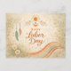This gentle Labor Day design blends bohemian charm with soft, nature-inspired symbolism. Centered around flowing script typography, the message “Happy Labor Day” is framed by delicate wildflowers, leafy branches, and whimsical details like hanging feathers, hearts, and a crescent-and-sun motif. A softly arcing rainbow and textured, watercolor-style background create a calm, uplifting mood rooted in creativity, balance, and appreciation for everyday work. The warm, earthy palette of terracotta, sage, cream, and muted pastels gives this piece a peaceful, handcrafted feel a boho, cottagecore, or nature-loving aesthetic.