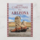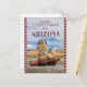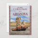 Esta postal de vacaciones muestra una espectacular fotografía occidental con botas de vaquero desgastadas con un par de espuelas de peso mexicano hechas de personalizado, con letras de "Yeeha" y correas de cuero. El texto rojo en la parte superior dice "Feliz Navidad desde Arizona", con el ARIZONA hecho de un patrón de chapa de búfalo rojo y negro. Las botas se paran en madera frente a un cielo occidental azul, lleno de nubes. Un borde de copos de nieve rojo y blanco hace que la carta sea más festiva.