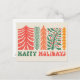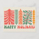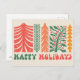 Esta vibrante tarjeta vacacional presenta un diseño retro con una serie de árboles estilizados en tonos rojos, naranjas y verdes, cada uno con su propio patrón único y decorativo. Los árboles están adornados con estrellas, bayas y ramas festivas que evocan un sentimiento de alegría y de capricho durante las vacaciones. Las palabras "Felices Fiestas" se muestran en negrita y juguetón en la parte inferior, añadiendo un toque nostálgico a este encantador diseño. Perfecto para enviar alegres saludos durante la temporada festiva con un estilo vintage.