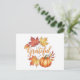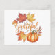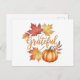 Comparte un mensaje de gratitud y aplaude la caída con esta hermosa tarjeta postal navideña de calabaza grata y hojas de otoño. Este diseño cuenta con una calabaza encantadora rodeada por una vibrante colección de hojas de otoño en tonos cálidos y tierra. La elegante tipografía y las clásicas imágenes de otoño hacen que sea perfecto para saludos de Acción de Gracias, correspondencia de temporada de otoño o como una tarjeta de agradecimiento sentida. Ideal para enviar a amigos, familiares o clientes, esta postal captura el espíritu acogedor y agradecido de la temporada. Una manera deliciosa de celebrar la cosecha y compartir su aprecio. Esta postal de otoño seguramente alegrará el día de cualquiera.