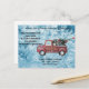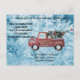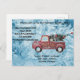 Postal Festiva camión de cosecha roja sobre fondo de copo de niev