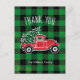 Envía a tus amigos y familiares una tarjeta postal de agradecimiento con una foto personalizada única. Este diseño retro presenta un clásico camión pickup rojo con un árbol de Navidad fresco en la parte posterior. El texto superior dice "Feliz Navidad" y debajo está el nombre de su familia para personalizar. El fondo es un patrón rústico de cuadros de búfalo verde y negro. En la parte posterior de la tarjeta postal hay un saludo que dice "Amor y gracias por unirse a nosotros en su celebración de vacaciones y por su generoso regalo" con su firma debajo para que usted la personalice. Diseñado por artistas © Tim Coffey y Susan Coffey.