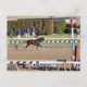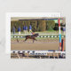 Charla Pacífica gana de principio a fin el primer día del año. El jinete Manuel Franco a bordo del caballo número 6 sale con rapidez mientras el resto del campo intenta mantenerse con él. Charla Pacífica ganó por 12 1/2 cuerpos dando dos vueltas. Esta foto muestra al jinete Manuel Franco frenando a Charla Pacífica bajo la línea de meta mientras se acerca al poste de la línea de meta roja, blanca y azul en el hipódromo de Aqueduct. Fleetphoto