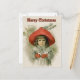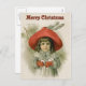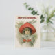 El chica dulce del vintage está listo para jugar. Ella los brazos es llena de bolas de nieve y ella está llevando un gorra rojo elegante con las plumas. El pino ramifica acento el fondo.