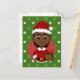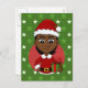 Una postal de Navidades con el ilustracion de un lindo sonriente chica afroamericano con el pelo negro corto, el chica está usando un disfraz de Santa Claus con un gorra rojo y sosteniendo un regalo; en un círculo rojo sobre un fondo verde con estrellas