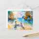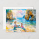 Pintura acuarela de dos chicas jugando en la arena cerca de una dramática formación rocosa costera junto al mar.